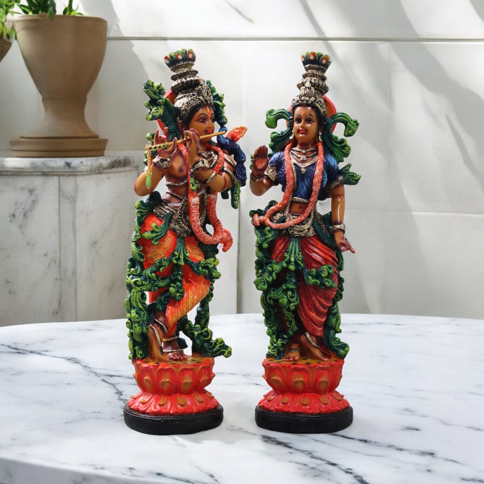 • Marble & Resin: For a more refined and polished appearance, we offer Radha Krishna idols made from high-quality marble or resin. These materials are chosen for their durability and smooth finish, allowing the vibrant colors and fine detailing of the idols to shine through. The soft sheen of marble and resin evokes a sense of serenity and purity, ideal for a personal shrine or meditation space.